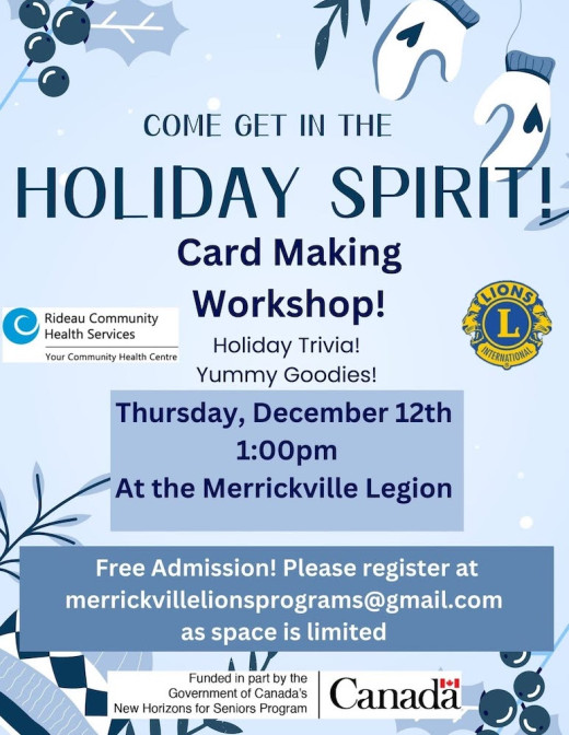 The Merrickville Legion Main Street West, Merrickville, OntarioThe Merrickville Lions Club and the Rideau Community Health Services are offering a free card-making workshop, with trivia and goodies for the holidays. Please register as space is limited.