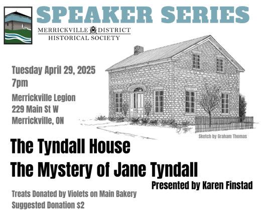Join the Merrickville & District Historical Society on Tuesday, April 29, 2025 at 7 pm at the Merrickville Legion for a fascinating talk: "The Mystery of Jane Tyndall and the Tyndall House" with Karen Finstad.