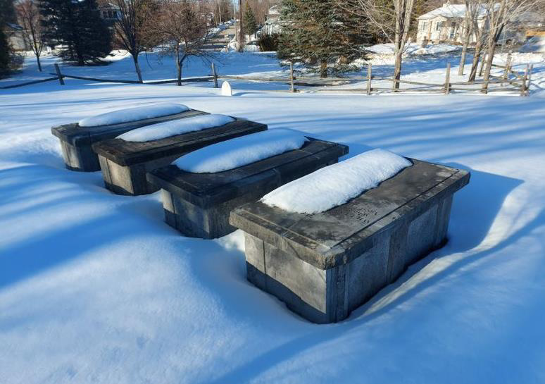 This memorial marks the area where an unknown number of persons were buried in this cemetery between the years 1800 and 1900. Despite the scarcity of records, it is believed that many died of pestilence, principally malaria, during the construction of the Rideau Canal. From 1826 to 1832, they were mostly Irish labourers and the children of pioneer settlers. Their graves were marked only by simple fieldstones, some of which remain visible.