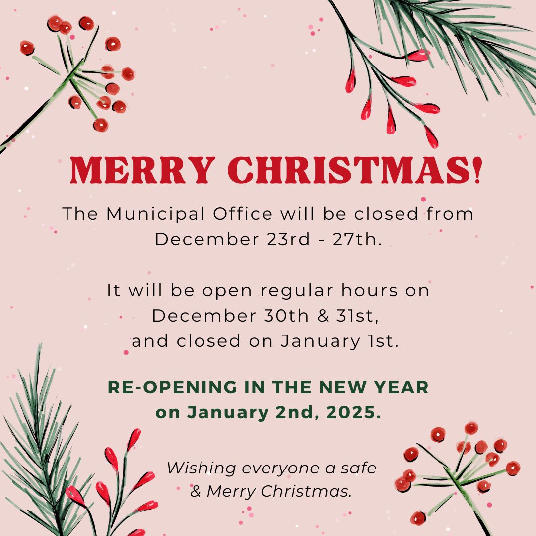The Municipal Office will be closed from Monday, December 23rd through to Friday, December 27th for the holidays.