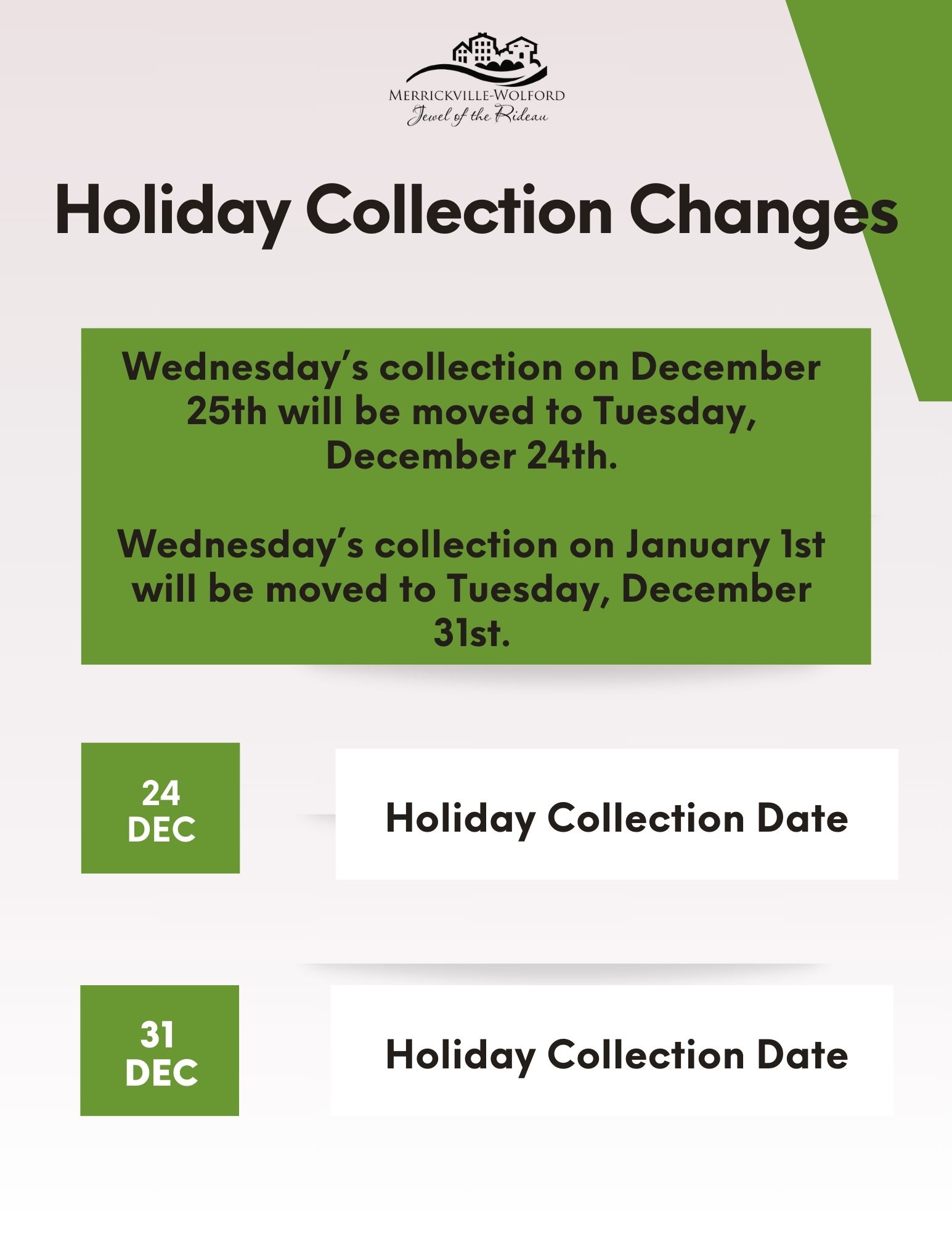 - Wednesday's Collection on January 1st will be moved to Tuesday, December 31st.