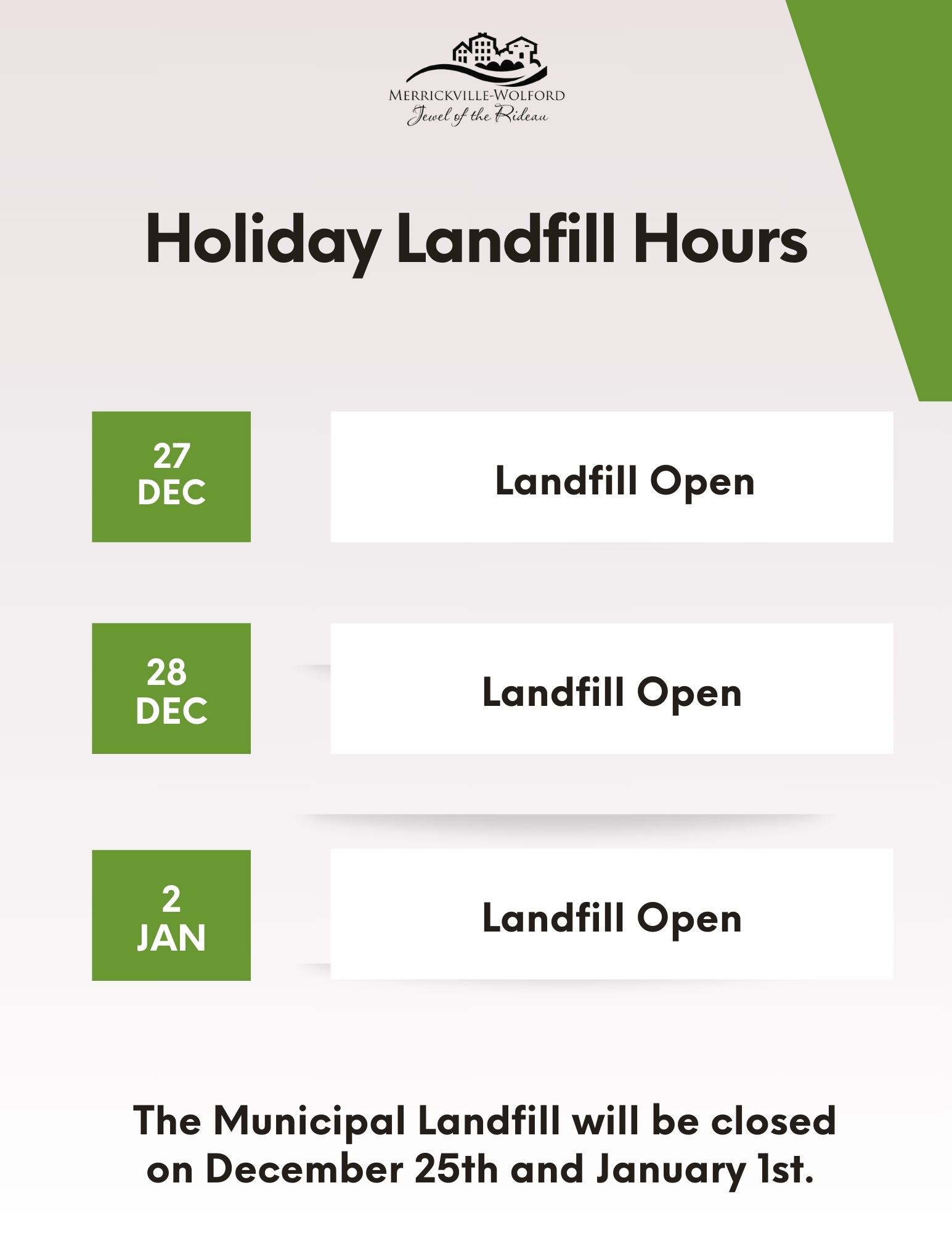 The Landfill will be open regular hours on Friday, December 27th, Saturday, December 28th and Thursday, January 2nd.